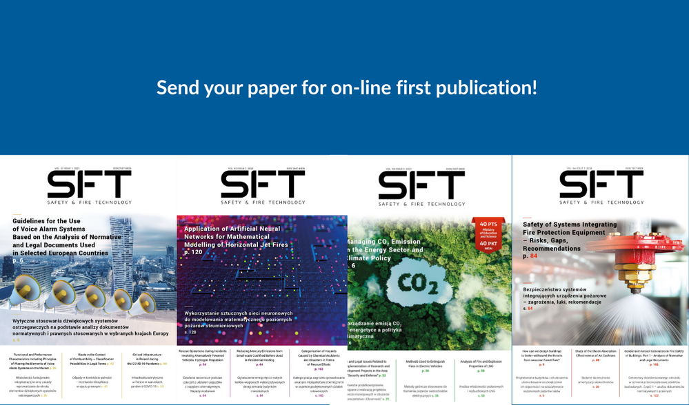 „Safety & Fire Technology“ is a peer-reviewed scientific journal. SFT publishes the following types of articles: original scientific articles, preliminary reports, review articles and case studies. Its aim constitutes in supporting the knowledge transfer in Poland and abroad, promoting research results and innovative projects as well as providing education on safety.